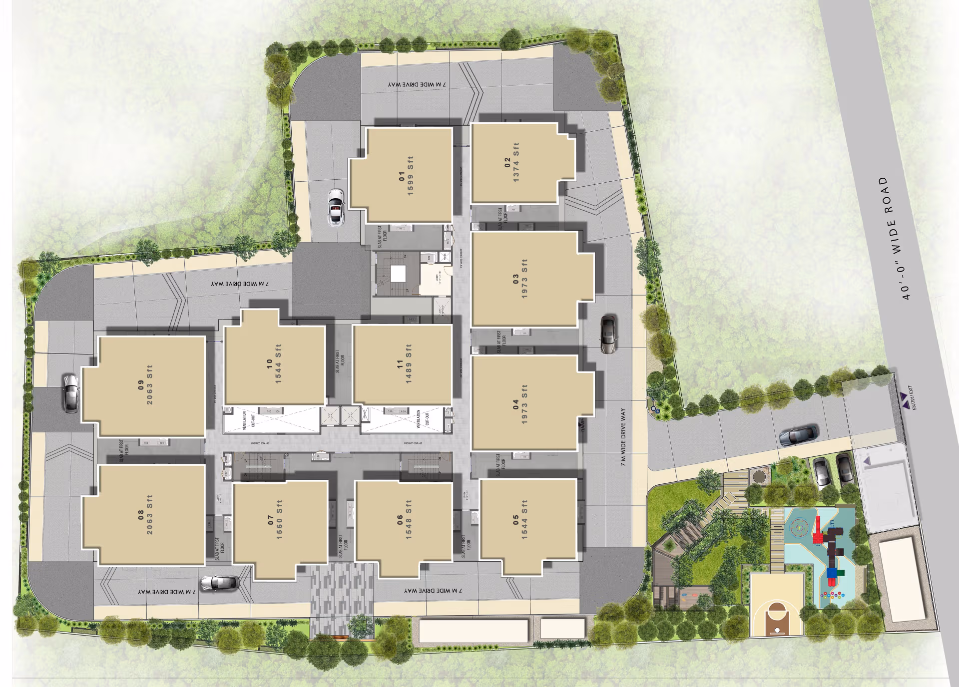 Clubhouse, gym, kids’ play area, landscaped lawn, multipurpose hall and outdoor courts for recreation.