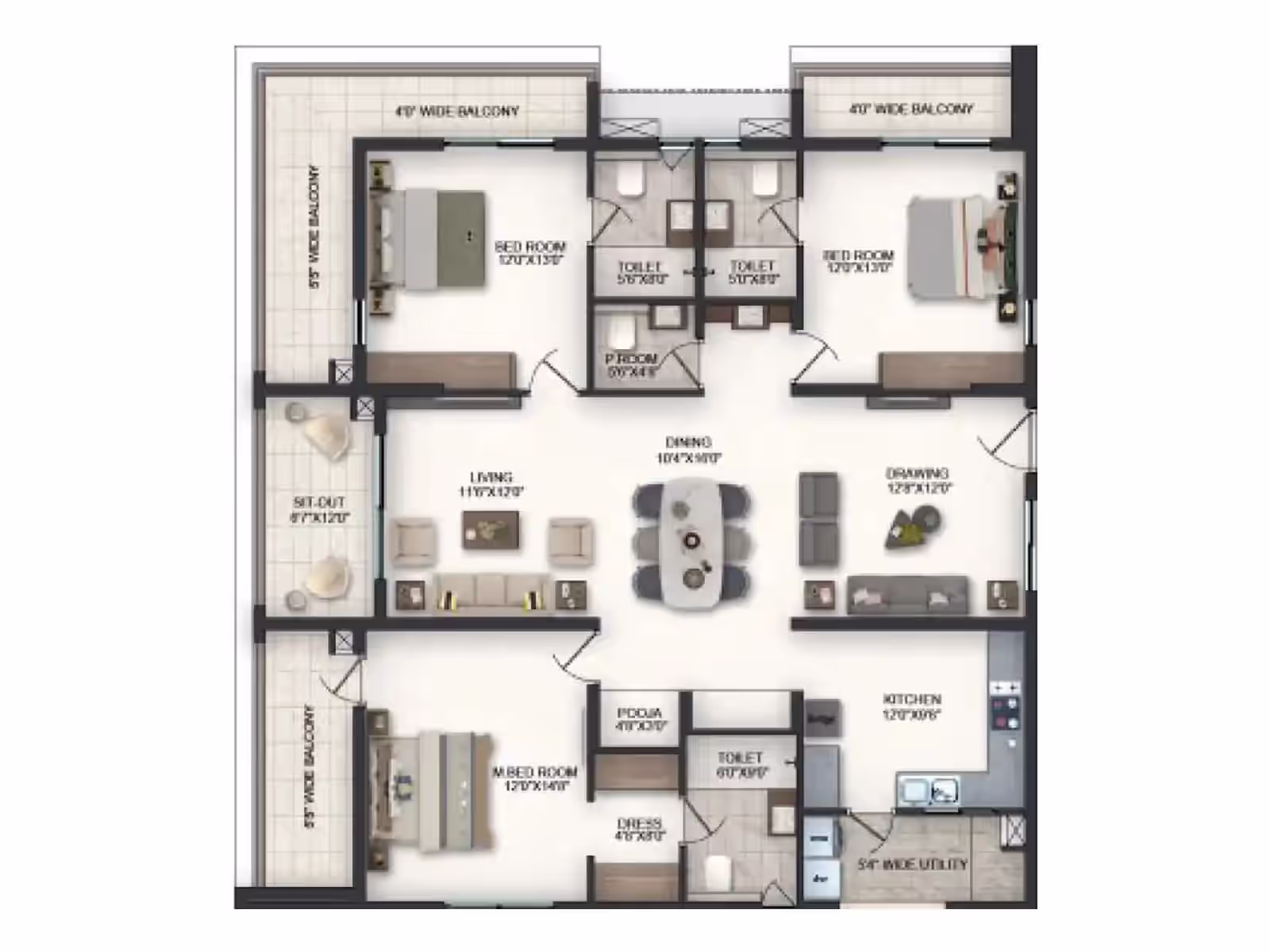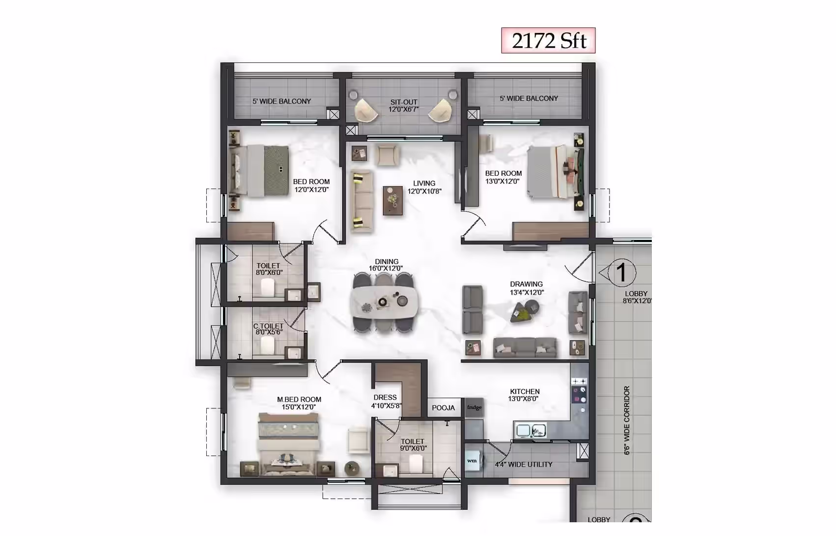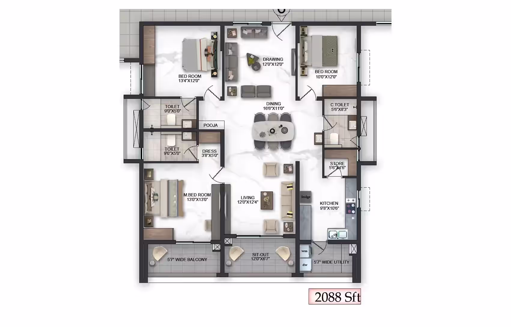 Premium fittings, vitrified tiles, UPVC windows and robust RCC structure offer long-lasting quality.